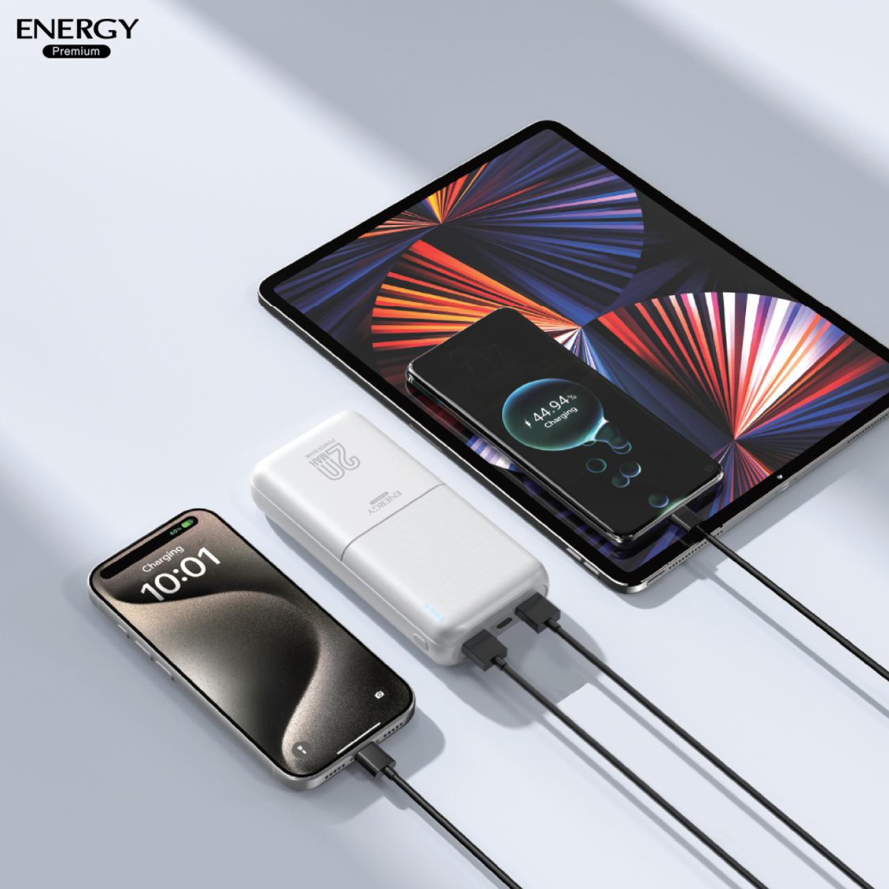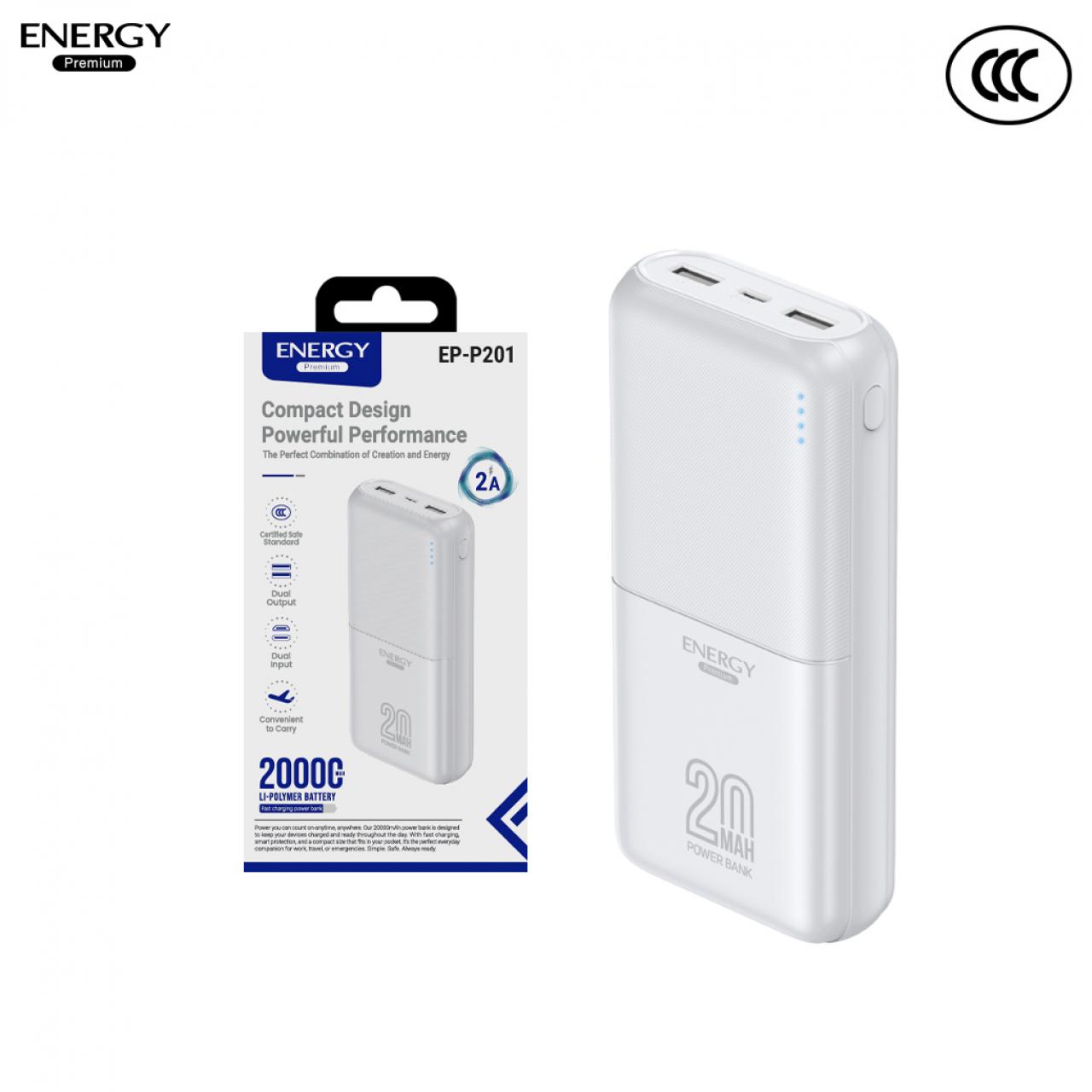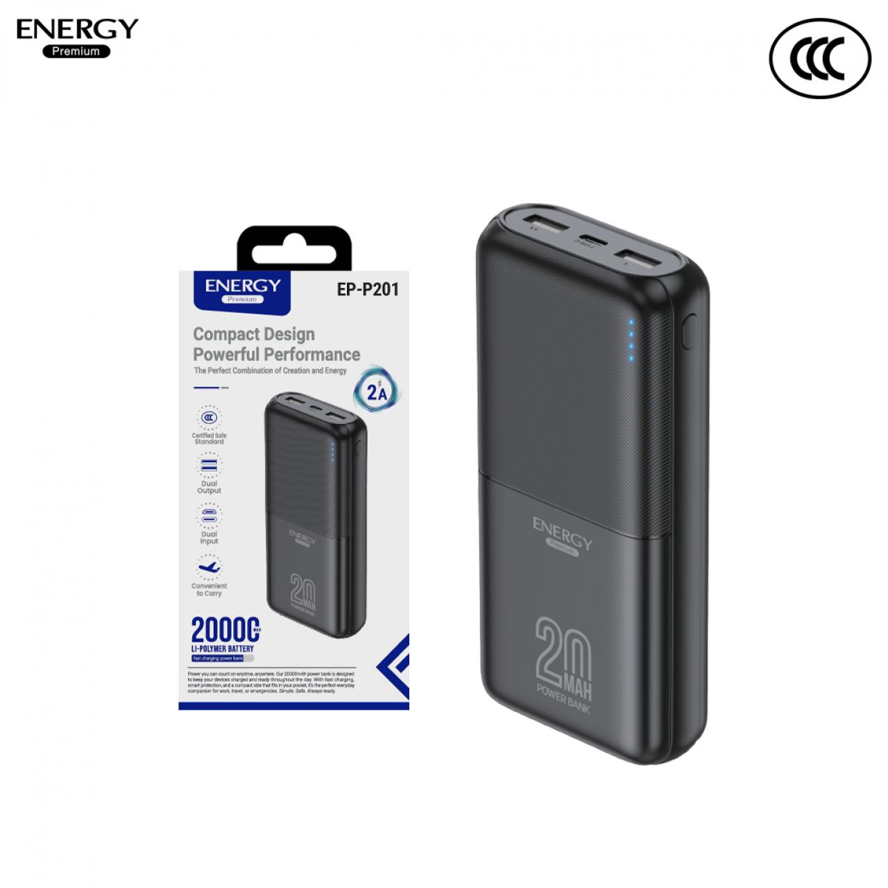Model EP-P201 [CCC] Battery Capacity : 20000mAh (3.7V/74Wh) Rated Capacity : 12000mAh (5V=2A) Micro Input : DC 5V=2A Type-C Input : DC 5V-2A USB Output 1 : DC 5V=2A USB Output 2 : DC 5V=2A