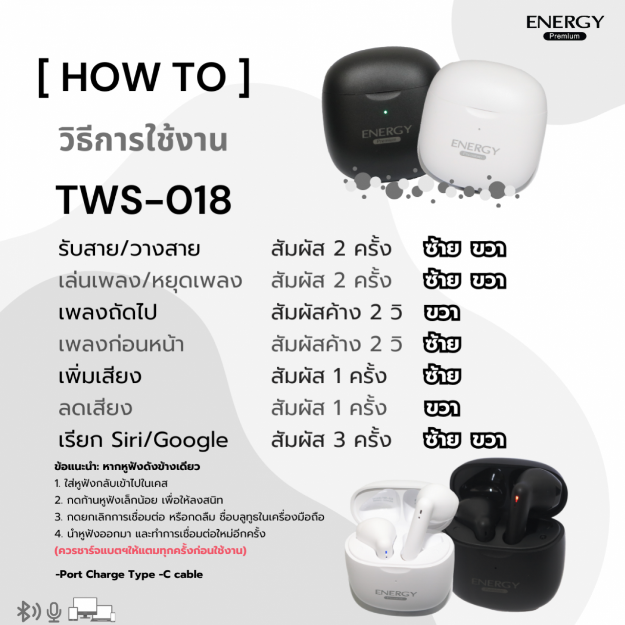 TWS หูฟังไร้สาย Ver5.3 ใช้งานต่อเนื่องนาน 3-4 ชม.