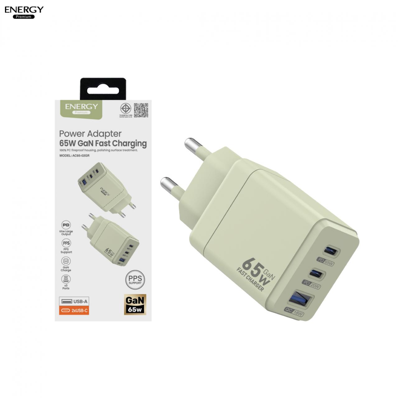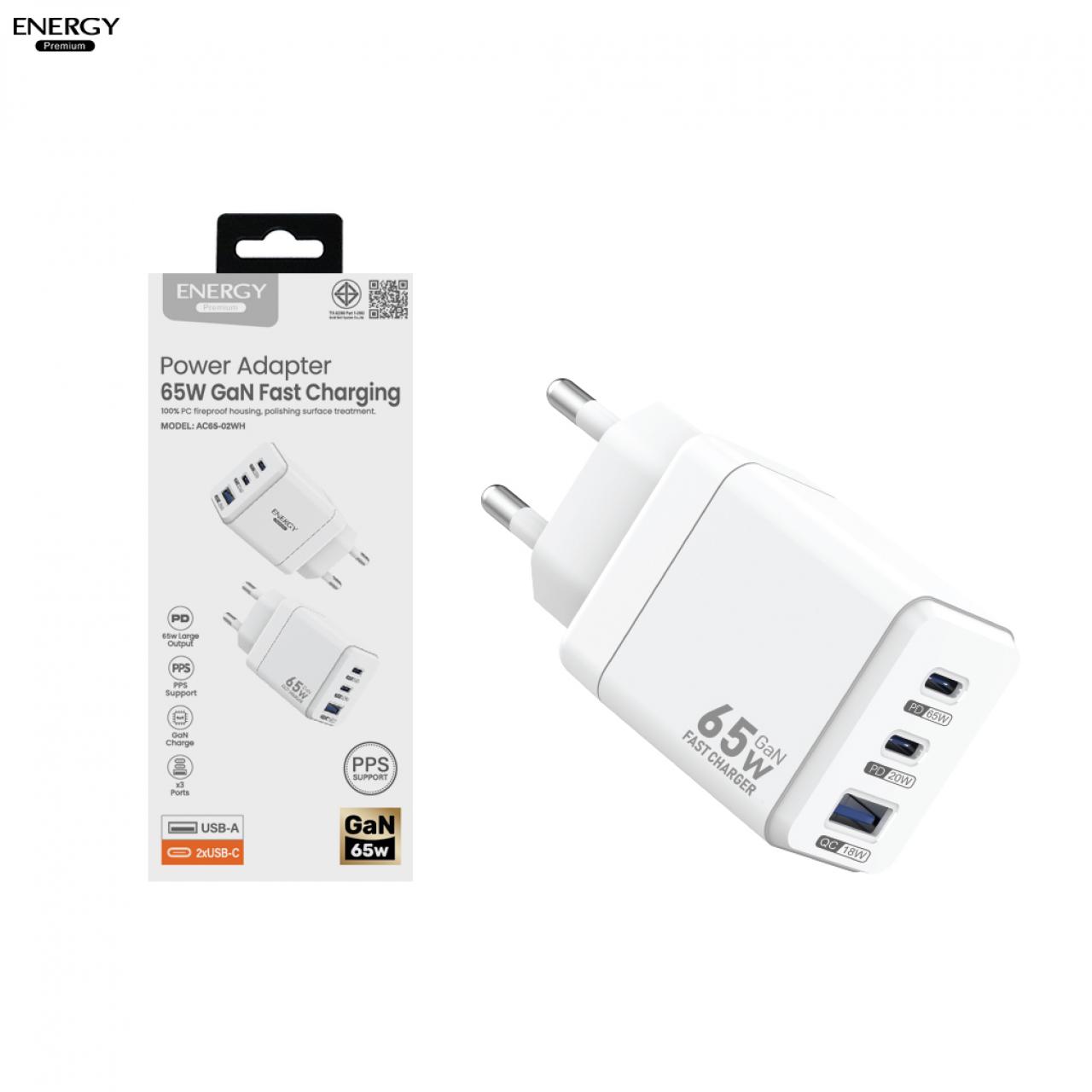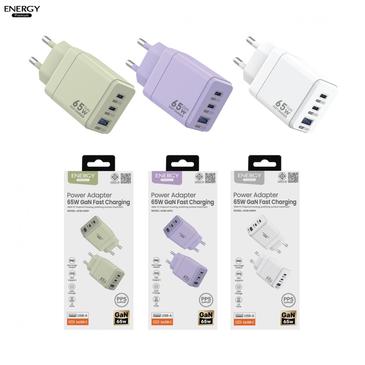 อะแดปเตอร์ GaN ชาร์จเร็ว PD 65W 1 พอร์ต + PD 20W 1 พอร์ต + USB 18W 1 พอร์ต รองรับ PPS