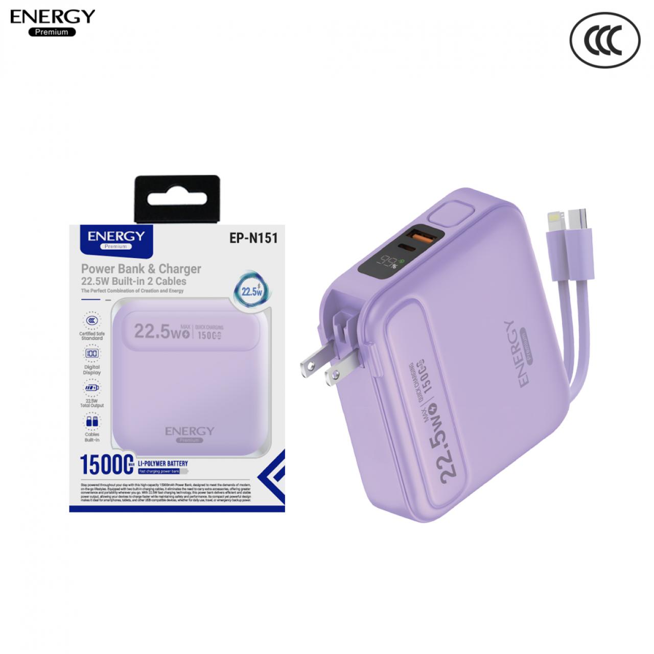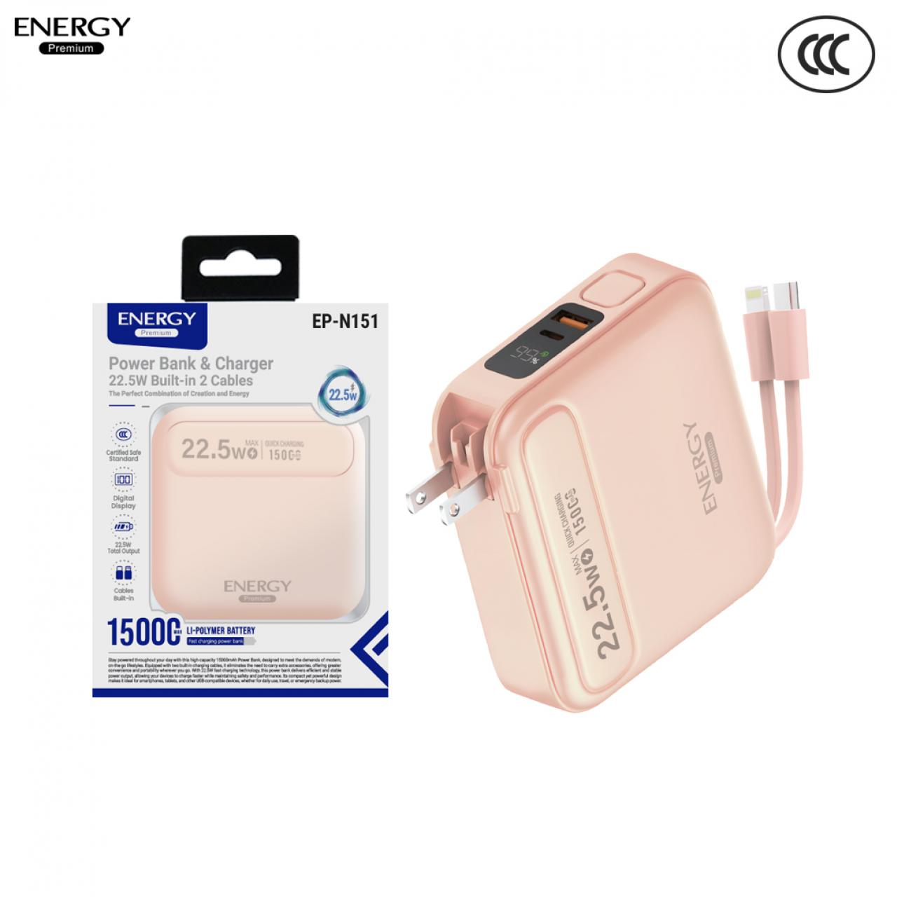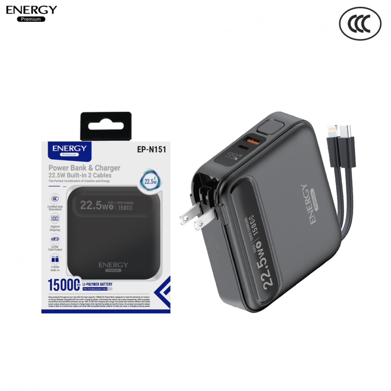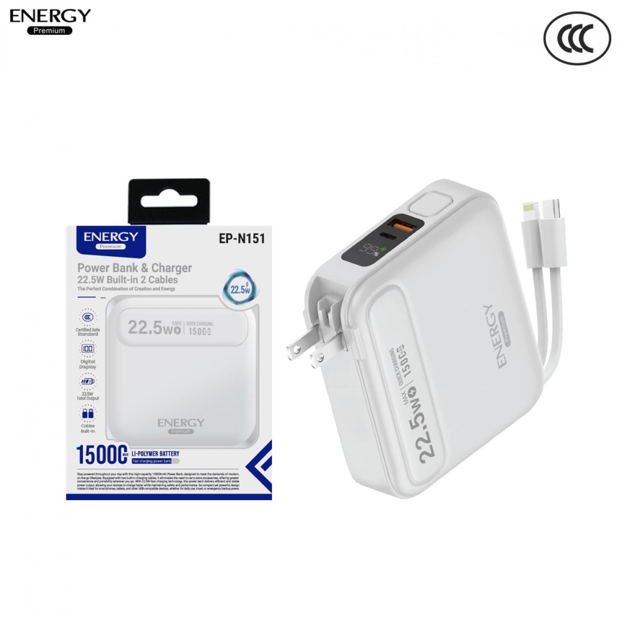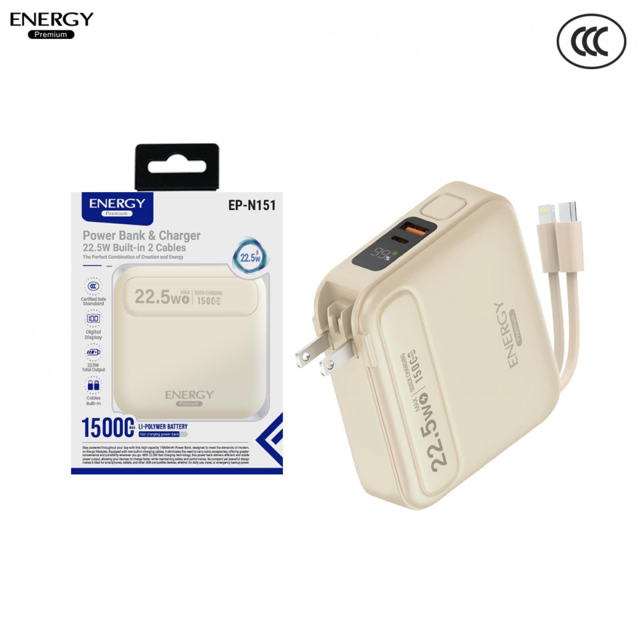 พาวเวอร์แบงค์ EP-N151 ความจุ 15000mAh ชาร์จเร็ว PD 22.5W +ขาปลั๊ก สายในตัว 2IN1